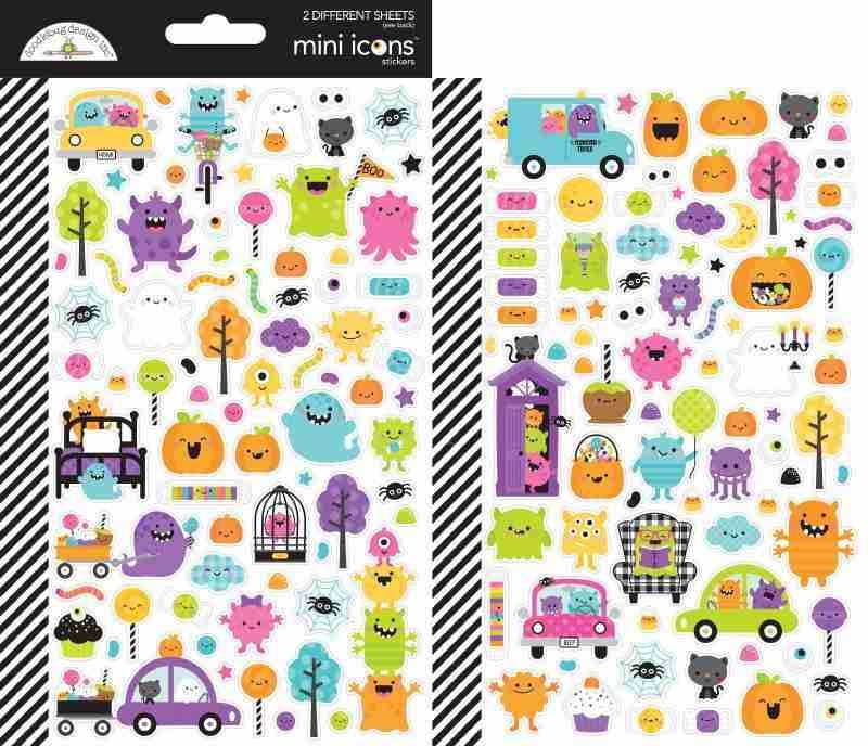 This package of two Mini Icons 5.5″ x 8.5″ sticker sheets is part of the Monster Madness Collection from Doodlebug Design. These stickers are precision die cut stickers made from 80 lb cardstock which is medium-weight cardstock. These stickers have repositionable adhesive on the back. These stickers include lots of pumpkins, lots of smiling and laughing monsters, ghosts, candy pieces, cards, wagons, spiders and spiderwebs, and more. These stickers can be added to cards, scrapbook pages, tags, journals, planners, and other paper crafting and mixed media projects. These stickers are acid and lignin free.