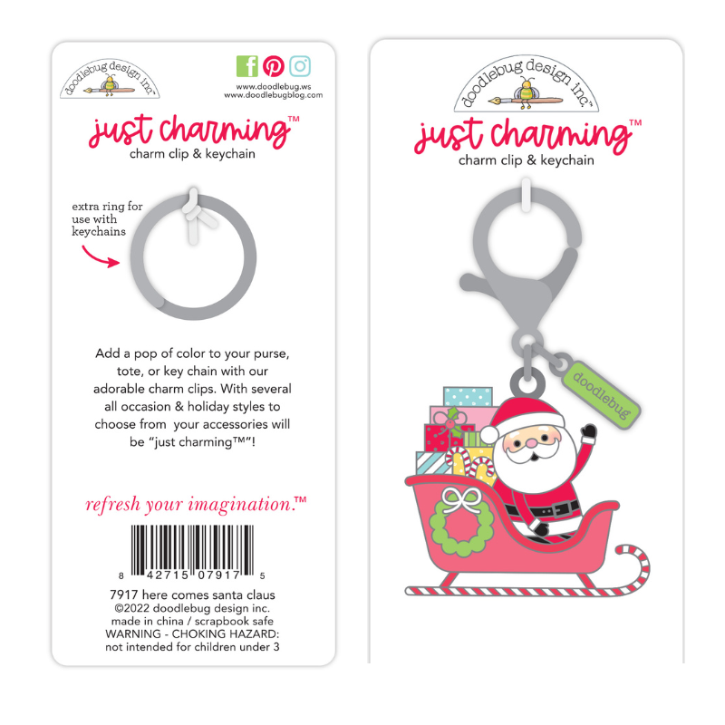 This Just Charming Clip and Keychain, Here Come Santa Claus, is part of the Candy Cane Collection from Doodlebug Design. This keychain features Santa in his sleigh with a candy cane runner, a wreath on the side, and presents in the back along with the Doodlebug marker. This keychain is a limited edition, it is made of high-quality, hard enamel. This keychain can be added to any clothing with a zipper, purses, or backpacks, it can be given as a gift, or it can be added to your collection.