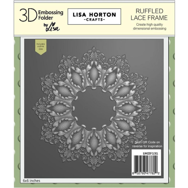 This amazing high-quality 3D Embossing Folder set features a beautiful lacy frame and includes a separate coordinating outline die. Perfect for your cards and projects. Embossing Folders produce a deep and intricate embossed effect with different levels of embossing for even more visual interest and then can be embellished with ink, paint, or other mediums. Coordinates with Lisa Horton Crafts Ruffled Lace Frame 6×6 Layering Stencils (LHCAS129). An essential in your craft stash! Designed by Lisa Horton.