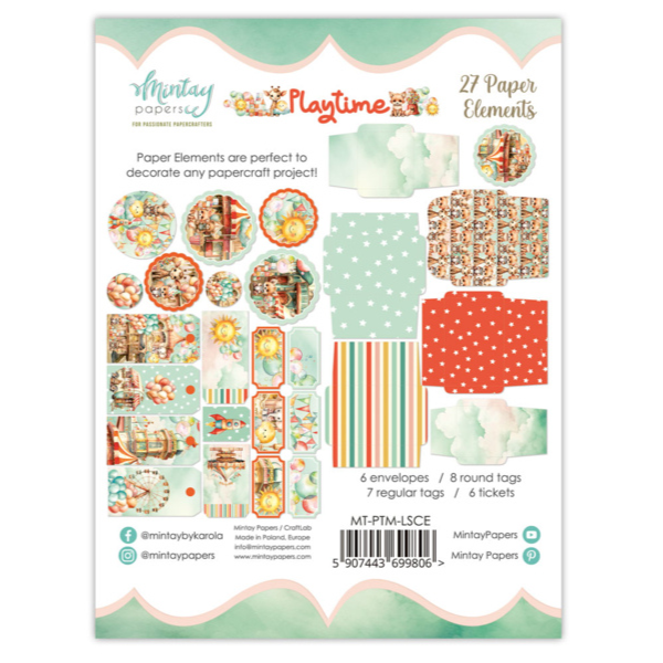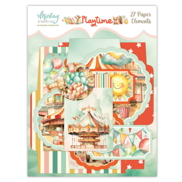 This package of 27 paper elements is part of the Playtime Collection from Mintay Papers. This package includes ticket shapes, scalloped circles, rectangles, circles, file cards, tags, envelopes, and more.